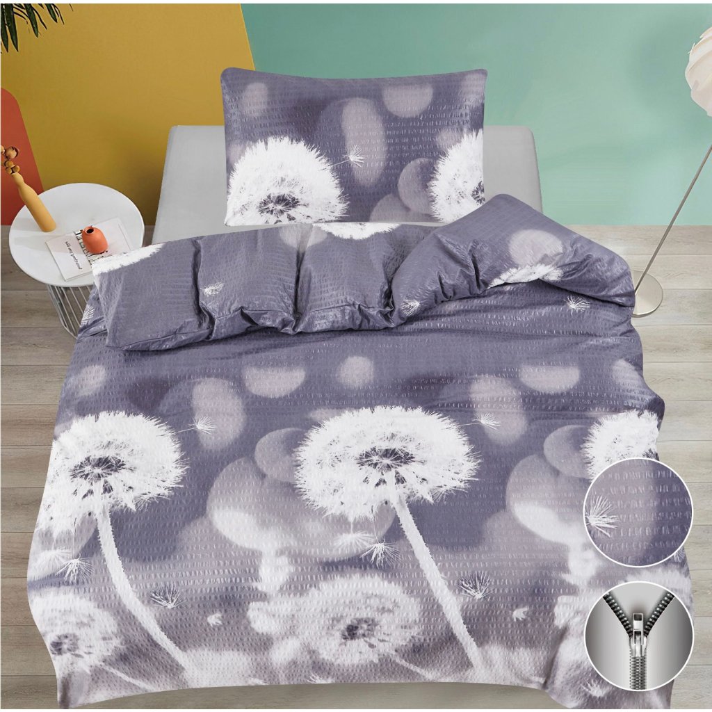 Oboustranné Bavlněné povlečení s 3D efektem 2dílné 140×200 + 70×90 – pampelišky, šedo-fialové, se zipem