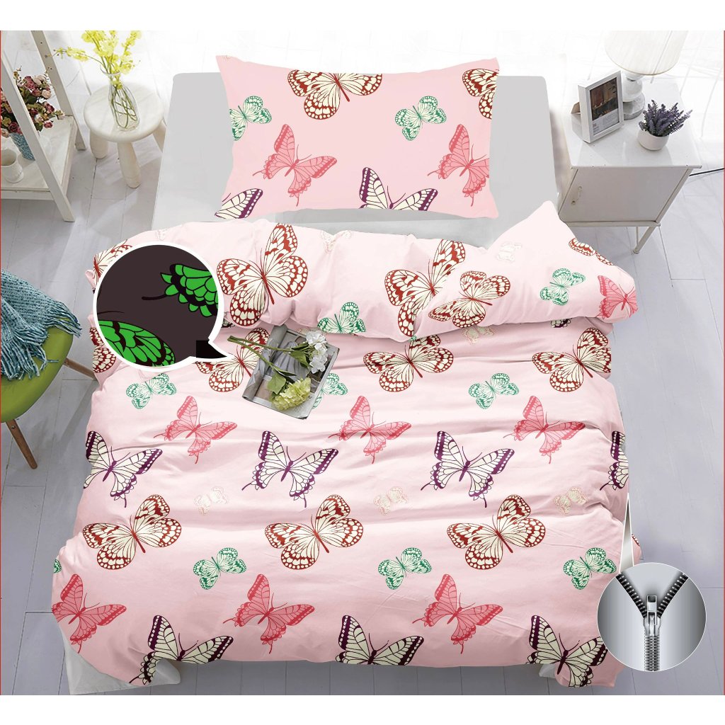 Luxusní bavlněné povlečení – Pink Butterfly svítící ve tmě | Růžové motýly, prodyšná bavlna, ZIP – 140x200 cm