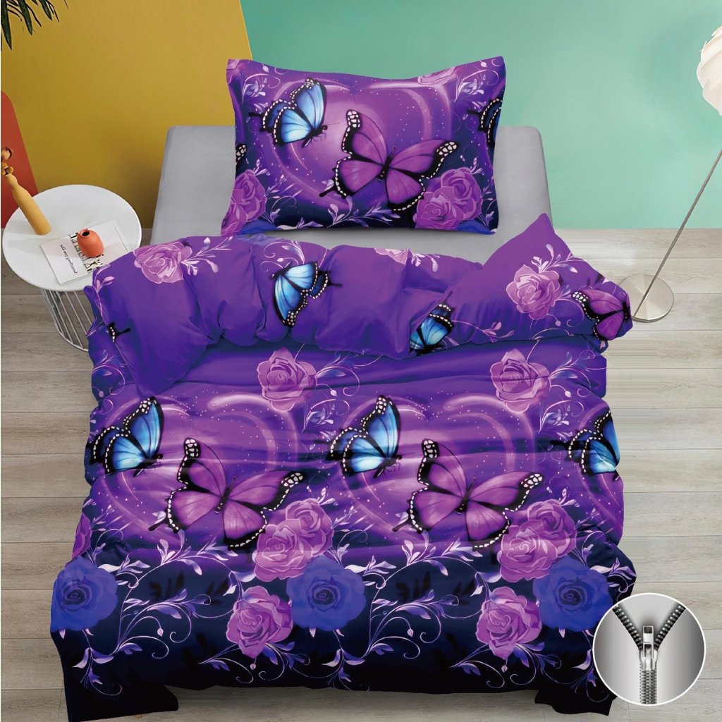 Luxusní bavlněné povlečení – Purple Butterfly | Romantické fialové květiny a motýli | Prodyšná měkká bavlna – 140x200 cm