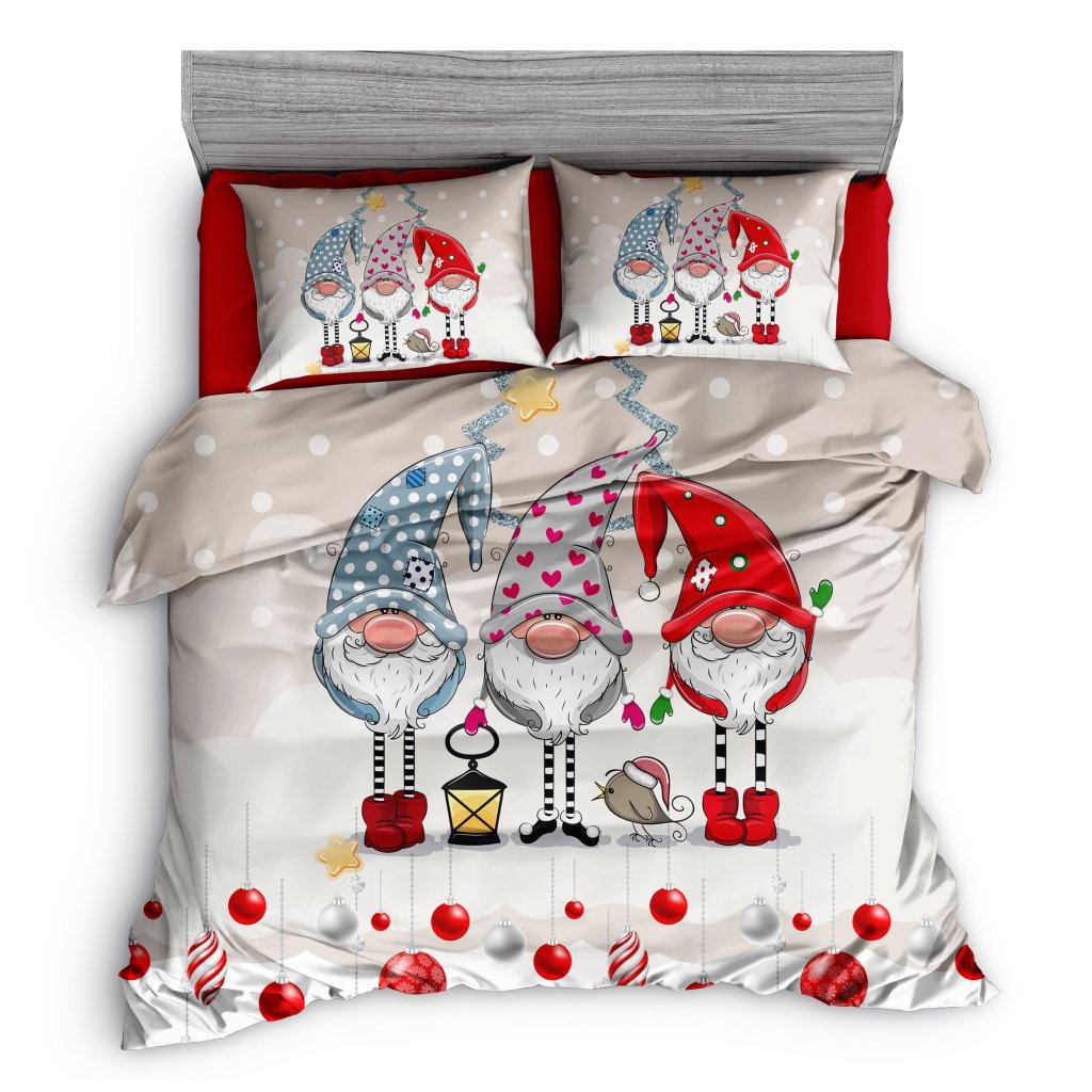 Bavlněné povlečení s prostěradlem pro dvoulůžko 140×200/70×90/40×50 – S motivem tří vánočních skřítků, 100 % bavlna